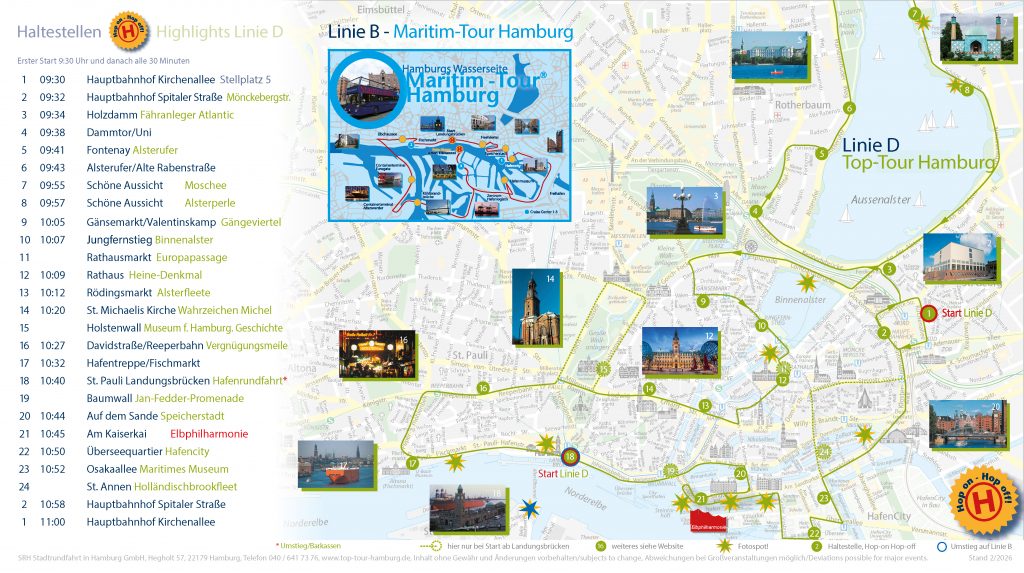 Alster: Die Alster ist ein Fluss, der durch die Stadt fließt und in zwei Teile aufgeteilt ist: die Binnenalster und die Außenalster. Die Binnenalster ist ein zentraler Punkt in der Innenstadt und wird von vielen historischen Gebäuden, Restaurants und Geschäften umgeben. Der Uferweg der Alster ist ein beliebter Ort für Einheimische und Touristen, um die Natur und die schöne Umgebung zu genießen. Bei unserer Stadtrundfahrt umrunden wir sowohl die Binnen- als auch die Außenalster! Haltestellen Holzdamm (3) Alsterufer (5 bis 8)